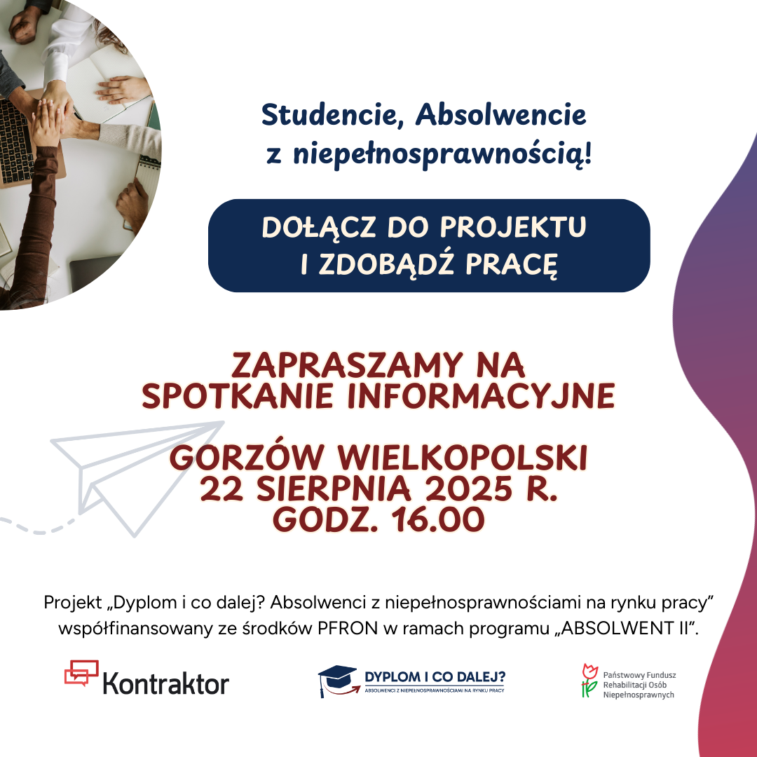 Dołącz do projektu „Dyplom i co dalej? Absolwenci z niepełnosprawnościami na rynku pracy” współfinansowanego ze środków Państwowego Funduszu Rehabilitacji Osób Niepełnosprawnych w ramach programu „ABSOLWENT II”.